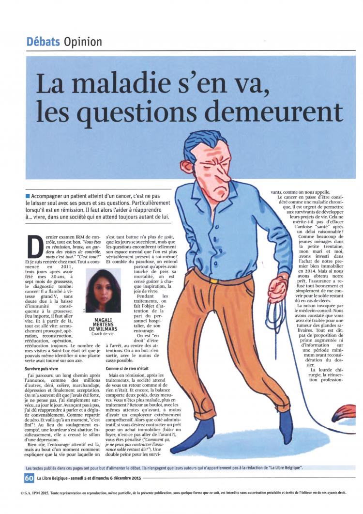 Mon opinion sur les difficultés des patients dans la transition "après-cancer" publiée par La Libre Belgique des 5-6 décembre 2015