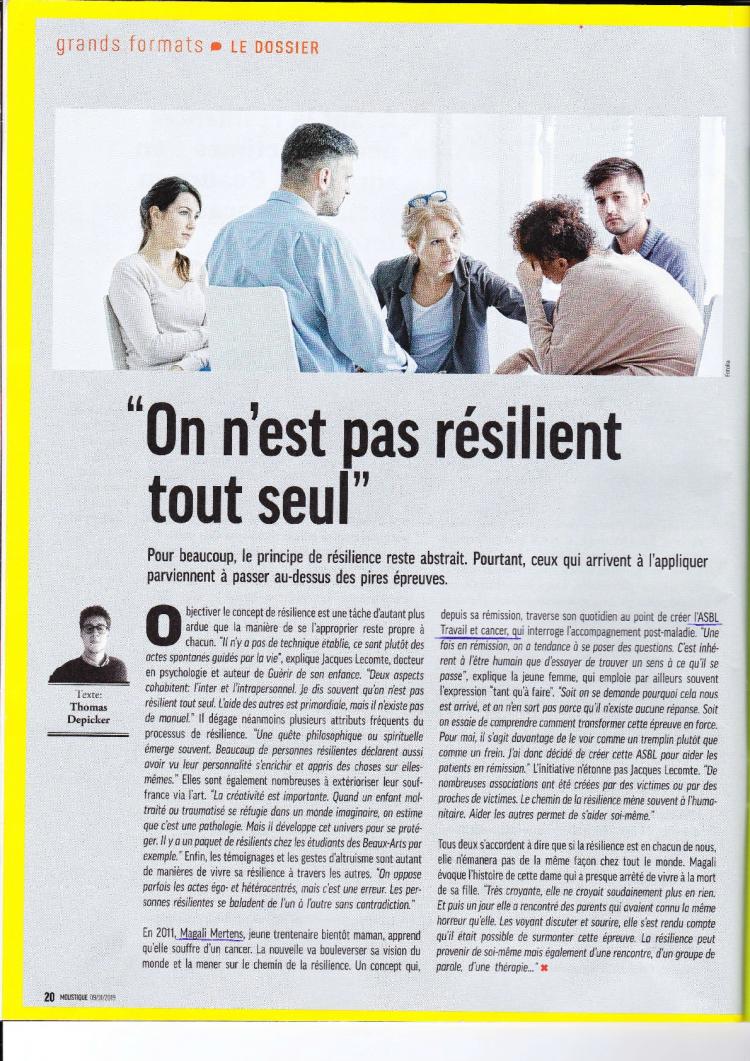 Cette semaine, l'hebdomadaire Moustique s'intéresse au mécanisme de la résilience. "Les agronomes parlaient de la résilience des sols quand après une inondation ou un incendie la vie reprenait". Le terme a été transposé à un mécanisme psychologique de transformation d'un traumatisme en force et popularisé par le neuropsychiatre et écrivain Boris Cyrulnic. Pour les personnes qui traversent un cancer, il y a aussi un mécanisme de reconstruction. L'art est un outil de résilience puissant, mais ce n'est pas la seule voie. Donner un sens à ce qui nous est arrivé à travers le service en est une autre. C'est ce qui a d'ailleurs été un déclencheur pour la création de l'association Travail & Cancer.