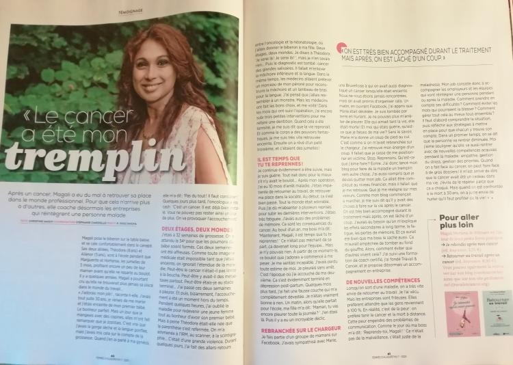 Le cancer n'est pas un cadeau, mais on peut l'envisager comme une occasion de changer ce que l'on souhaitait changer dans sa vie depuis longtemps sans oser le faire. J'ai un jour décidé que si je ne pouvais pas changer le "pourquoi", j'allais au moins agir sur le "comment". Comment allais-je utiliser cette douloureuse épreuve pour en faire une force et aller plus loin, plus haut ? Il en est sorti une totale reconversion professionnelle. Ce n'est pas la formule universelle, à chacun de trouver ce dont il a besoin de mettre davantage dans sa vie : du sens dans son travail, du temps avec ses proches, le contact avec la nature, un peu de tout ça à la fois, ou encore toute autre chose. Il n'y a que vous qui sachiez ce qui est bon pour vous. Une chose est sûre : quand je suis bien avec moi-même, je suis meilleure avec les autres. Merci à Femmes d'Aujourd'hui de partager mon histoire, qui est peut-être aussi la vôtre finalement...